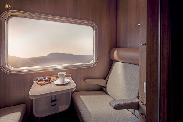 The Australis Suite is the most luxurious suite in Australian train travel. At three times the size of a Platinum cabin it features a separate bedroom with a fixed queen-sized bed, full lounge set, personal bar and en suite with double vanity and premium Jurlique amenities. This Suite also has a writing desk as well as a wardrobe and ample room to stretch your legs or host friends and family in-suite.